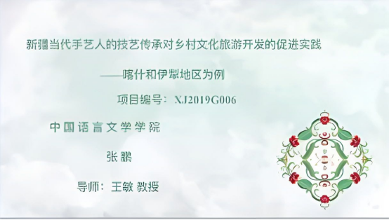 最后,18级博士研究生张鹏进行答辩的创新项目为《新疆当代手艺人的技艺传承对乡村文化旅游振兴的促进实践——以喀什和伊犁地区为例》,并从项目的基本情况、可行性方案、项目成果展示、成果研究等六方面的内容展开汇报。而后,专家老师对该项目进行了评价。成湘丽老师认为该课题将“产-学-研”相结合,创新性较强。但成果中的文学作品《小满》与前期的成果总结不相符,希望后期调整提交的材料。朱贺琴老师建议课题的研究成果要与申报书撰写的预期结果相符合。庞海音老师提出《小满》作为文学作品在一定程度上与项目成果的学术性不吻合,并提醒学生注意并综合梳理项目的学术性成果。