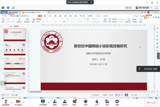首先,文艺学博士研究生张艳展开了以《新世纪中国网络小说影视改编研究》为题的创新项目成果汇报,向在席的专家老师分别汇报了项目完成情况、项目成果简介、网络小说及其影视改编的对于我国当下文化输出的价值参考等六方面的内容。之后,在席的专家老师展开了对该项目成果的点评。成湘丽老师指出,该项目的开展形式较为多样,所发表的两篇核心期刊论文基本达到预期研究目标。但搜集的364部电视剧文本在成果报告中没有形成具体的文本目录,建议整理出具有代表性的文本。朱贺琴老师认为,该项目的整体性框架完整,项目问卷调查完成度较好,但涉及文本范围较广,建议突出更明确的时间段或题材。庞海音老师提出该项目成果的报告中对于不同题材的影视剧的分类和定义可以更准确,融媒体用于分析该项目中的部分论点的研究方法有待商榷。