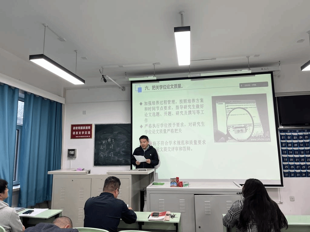 全面落实研究生导师立德树人职责的实施细则(试行)》;其次,就《研究生导师指导行为准则》出台背景向在座的各位老师解读并带领老师们学习《准则》的相关内容,结合学院实际情况及自身指导研究生经历从坚持正确思想引领、科学公正参与招生、精心尽力投入指导、正确履行指导职责、严格遵守学术规范、把关学位论文质量、严格经费使用管理、构建和谐师生关系八方面全方位对《准则》进行学习;最后,对研究生导师指导行为“十不得”进行宣讲。并要求全体研究生导师在今后研究生指导工作中,严格遵守《准则》内容,以身作则,坚持守好研究生导师是研究生培养的第一责任人的原则,培养优秀的高质量的复合型硕博士研究生。